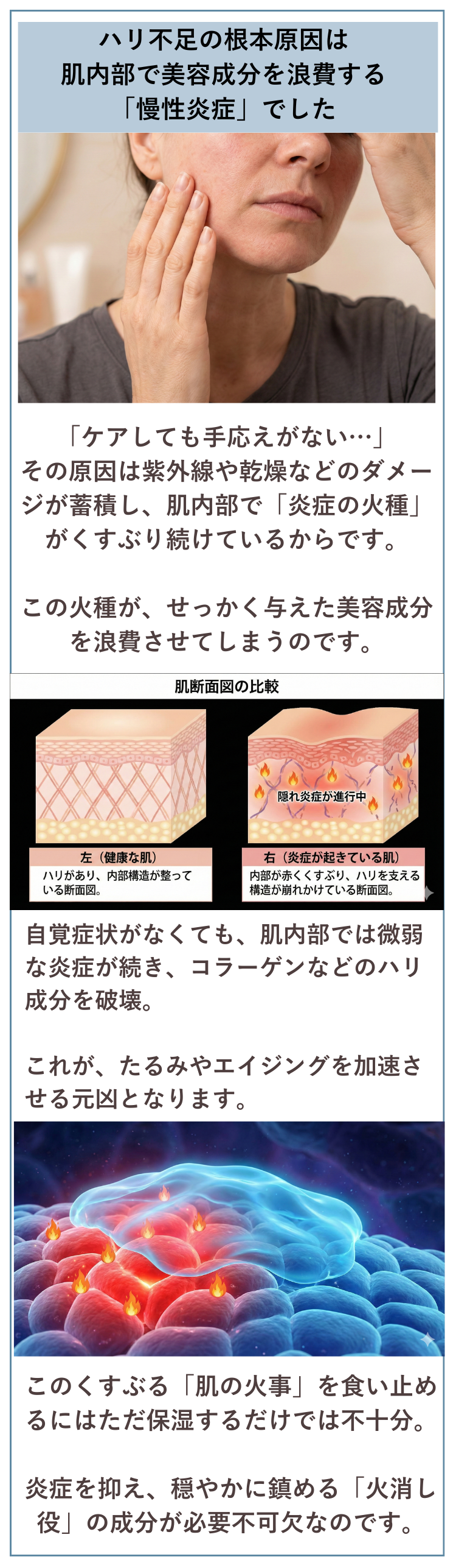 自覚症状がなくても、肌の内部では微弱な炎症(=肌の火事)が起き続けていることを知っていますか?
